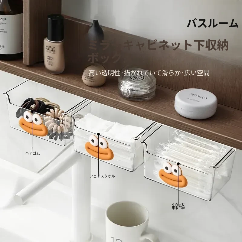 透明な引き出し式化粧品収納ボックス - おしゃれなバスルーム整理に最適!ミラーキャビネットと一体化した引き出し収納ラックで、スペースを有効活用し、すっきりとした印象を演出します。