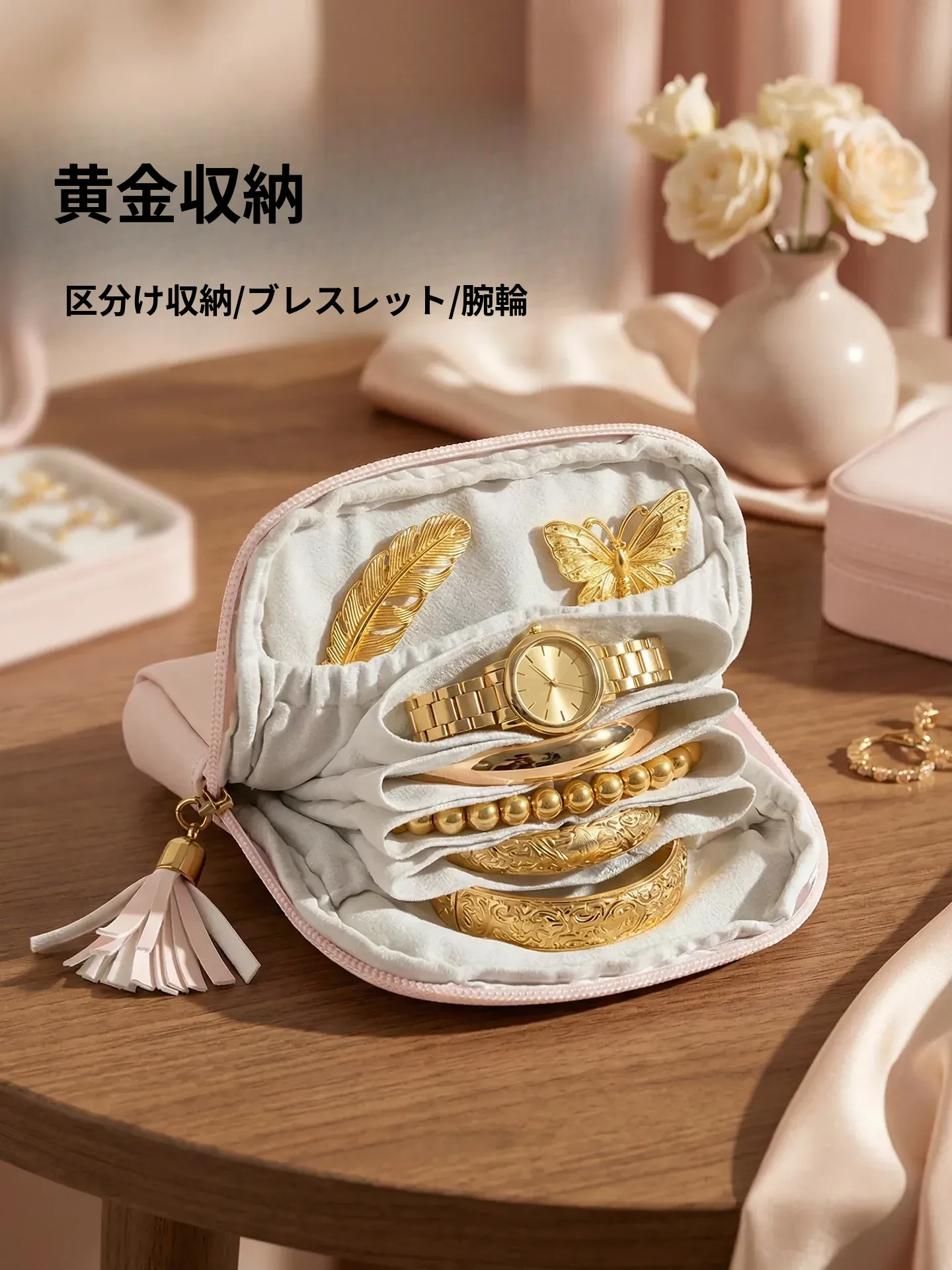 ゴールドジュエリー収納ポーチ - 持ち運びに便利なジュエリー袋!ネックレス、イヤリング、指輪をしっかり守る収納マスター。大切なアクセサリーを美しく整理し、いつでもスタイリッシュに!