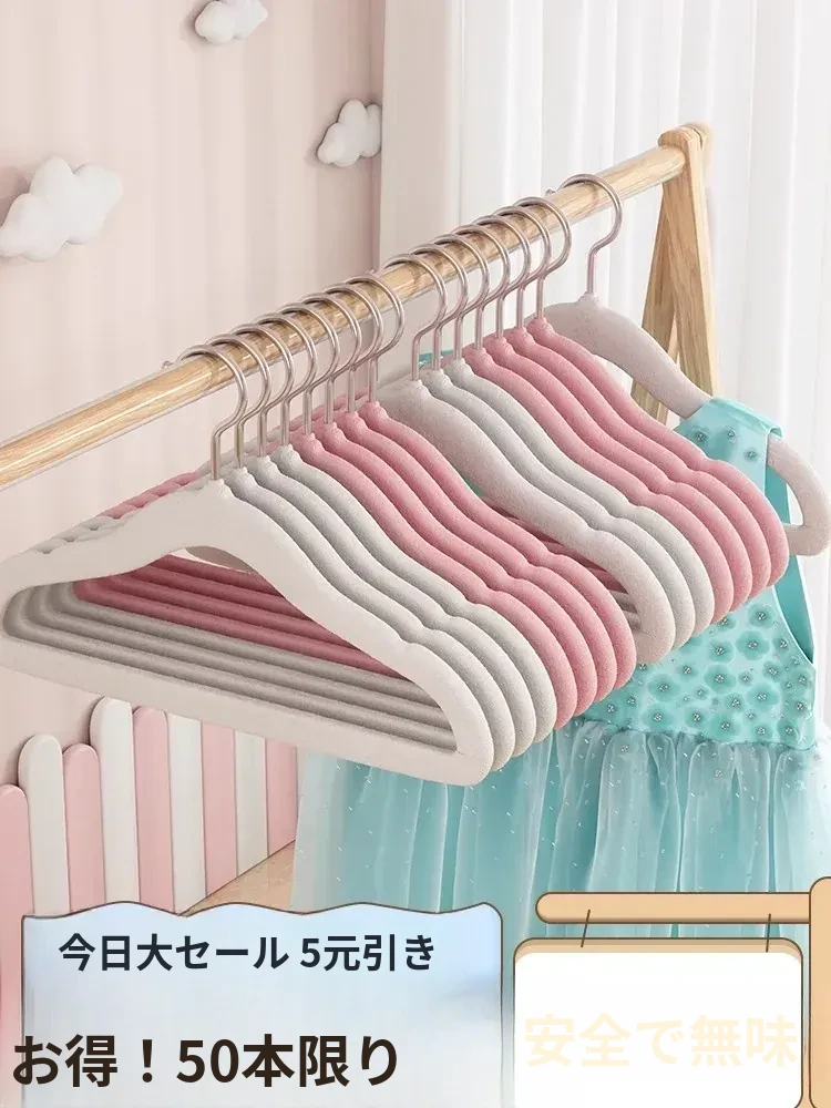 子供用フロッキーコートハンガー - 赤ちゃんや小さなお子様のための滑らないデザイン!家庭用にも最適で、成長に合わせて使える中・大サイズもご用意。衣類をしっかり支え、キレイに収納できる便利なハンガーです!