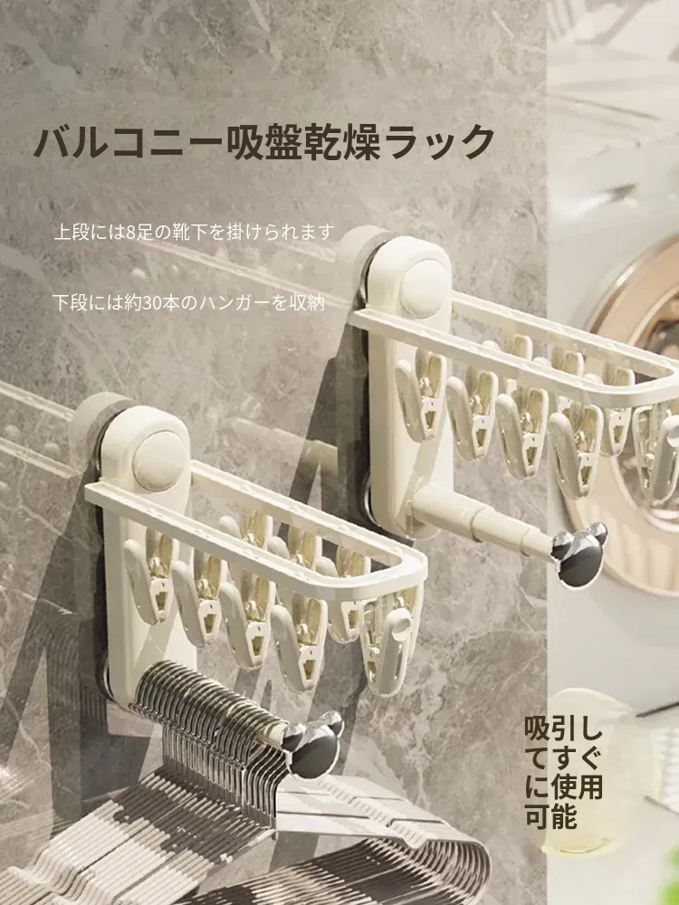吸盤式衣類ハンガー収納神器!家庭用バルコニーに最適な伸縮整理ラック、多機能干し竿。穴をあけずに簡単取り付け、クリップフック付きで便利さ抜群!