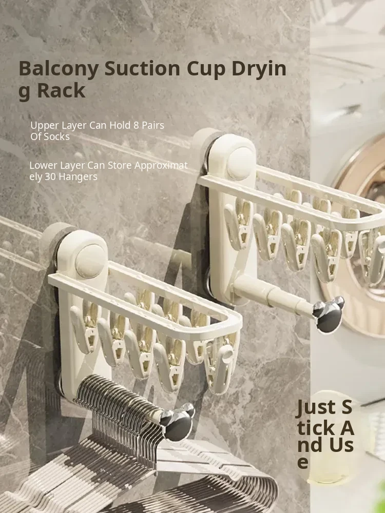 Versatile Suction Cup Clothes Hanger - Space-Saving Telescopic Organizer for Home and Balcony, No Drill Required, Features Clips and Hooks for Easy Drying and Storage