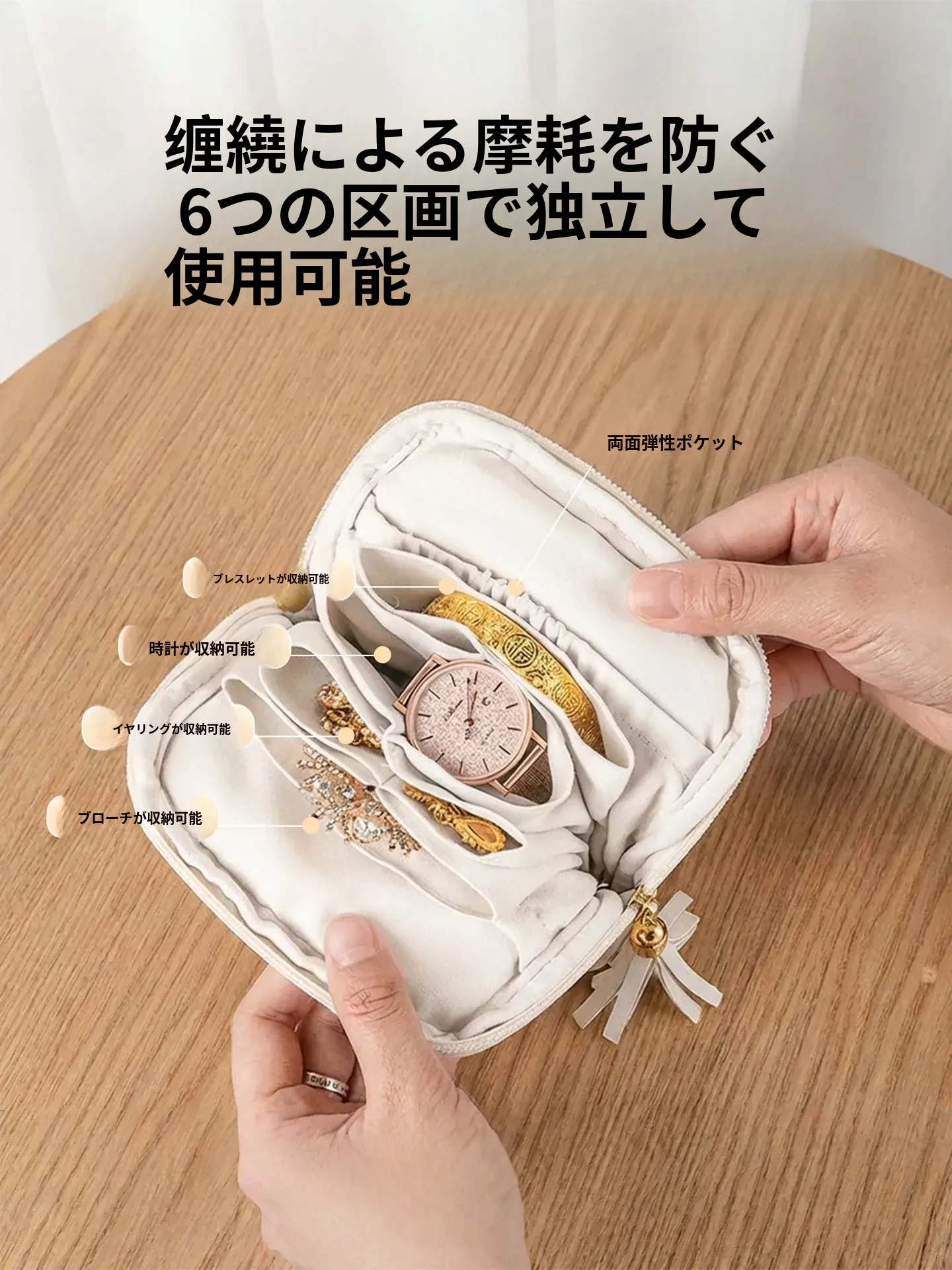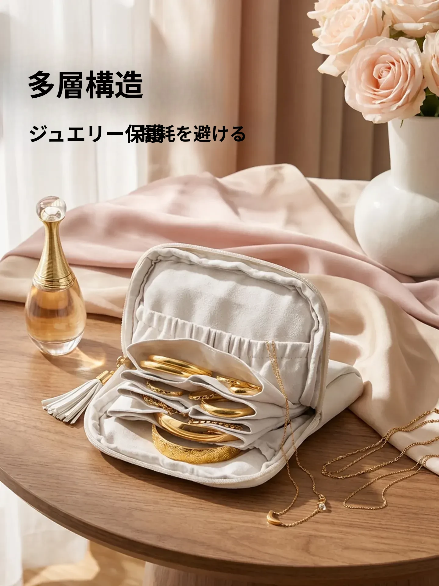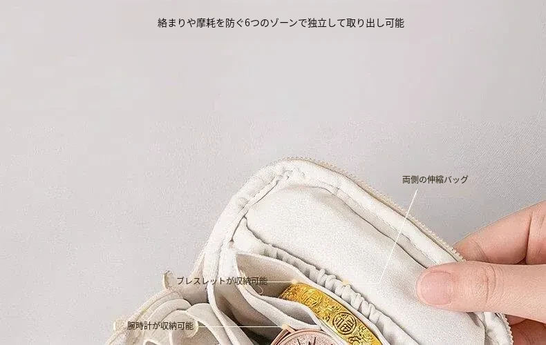 ゴールドジュエリー収納ポーチ - 持ち運びに便利なジュエリー袋!ネックレス、イヤリング、指輪をしっかり守る収納マスター。大切なアクセサリーを美しく整理し、いつでもスタイリッシュに!