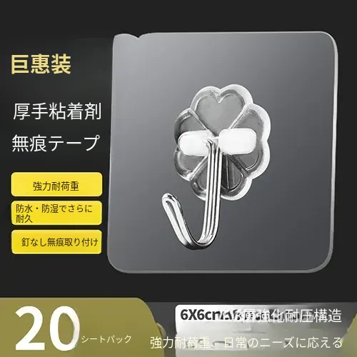 厚手強力粘着透明フック(20個入り)