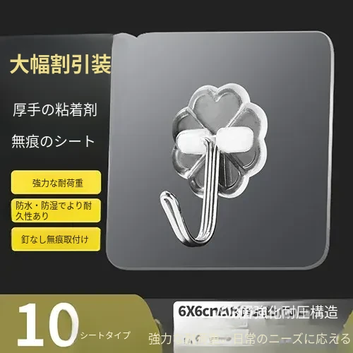 厚手強力粘着透明フック(10個入り)