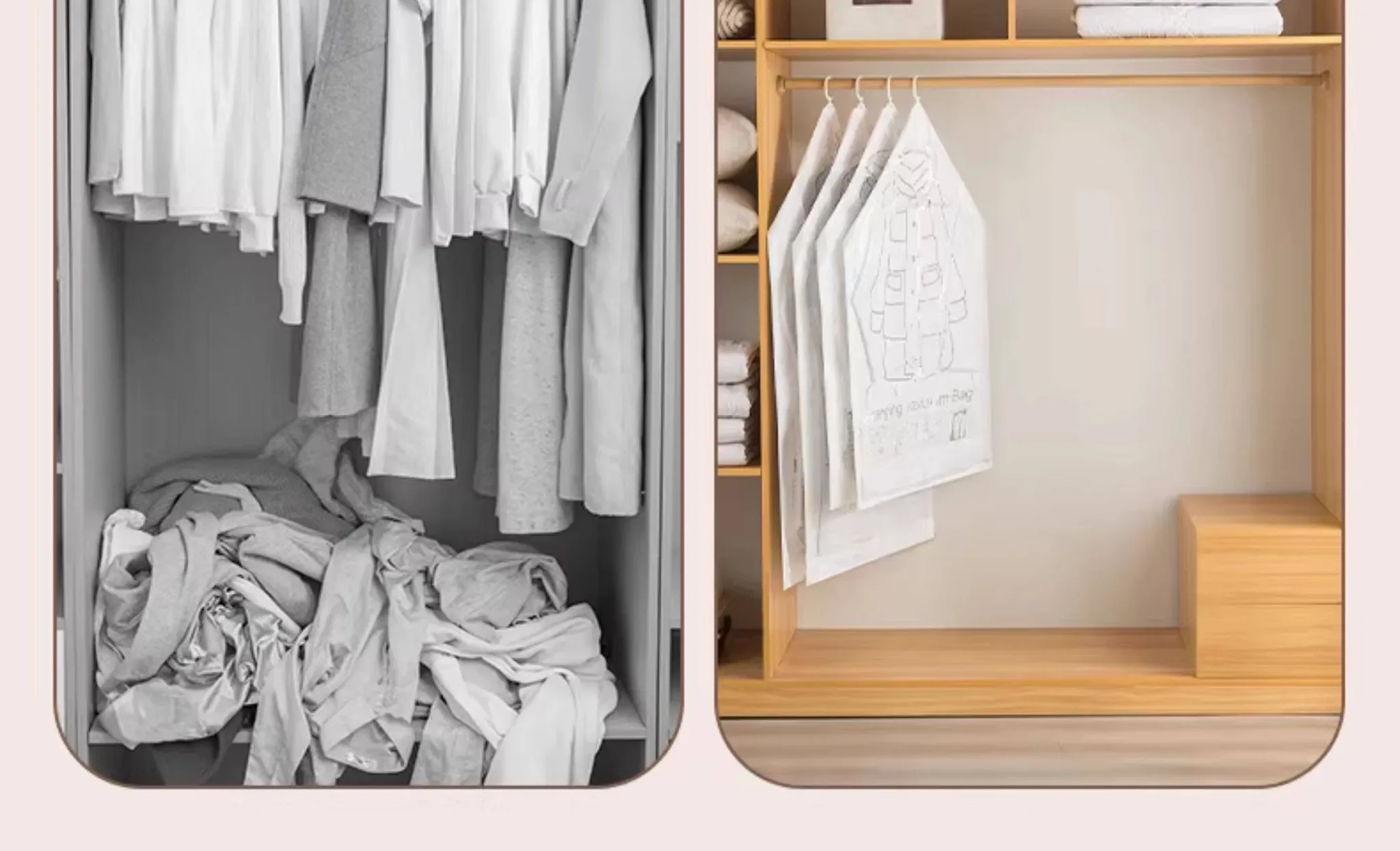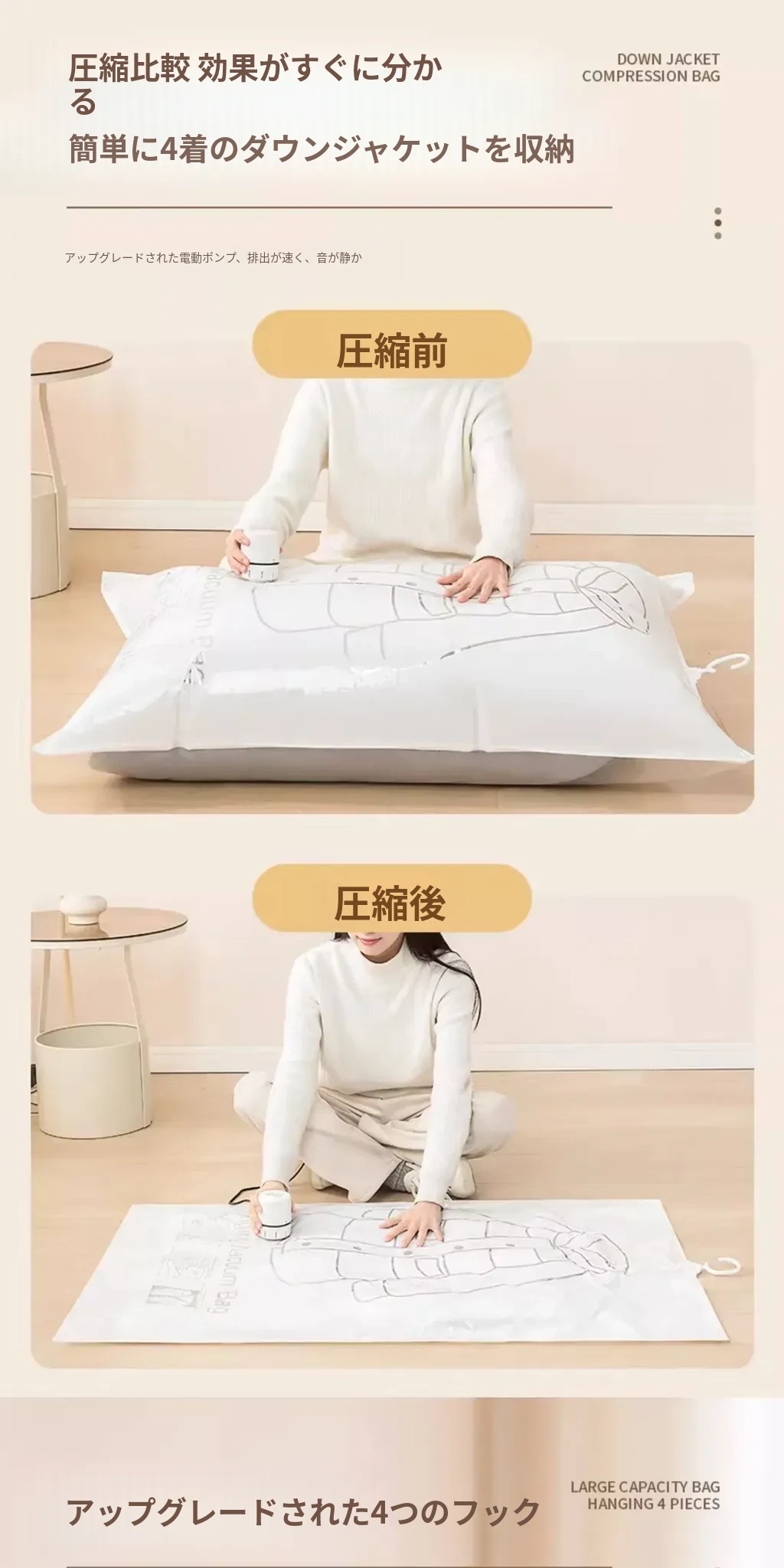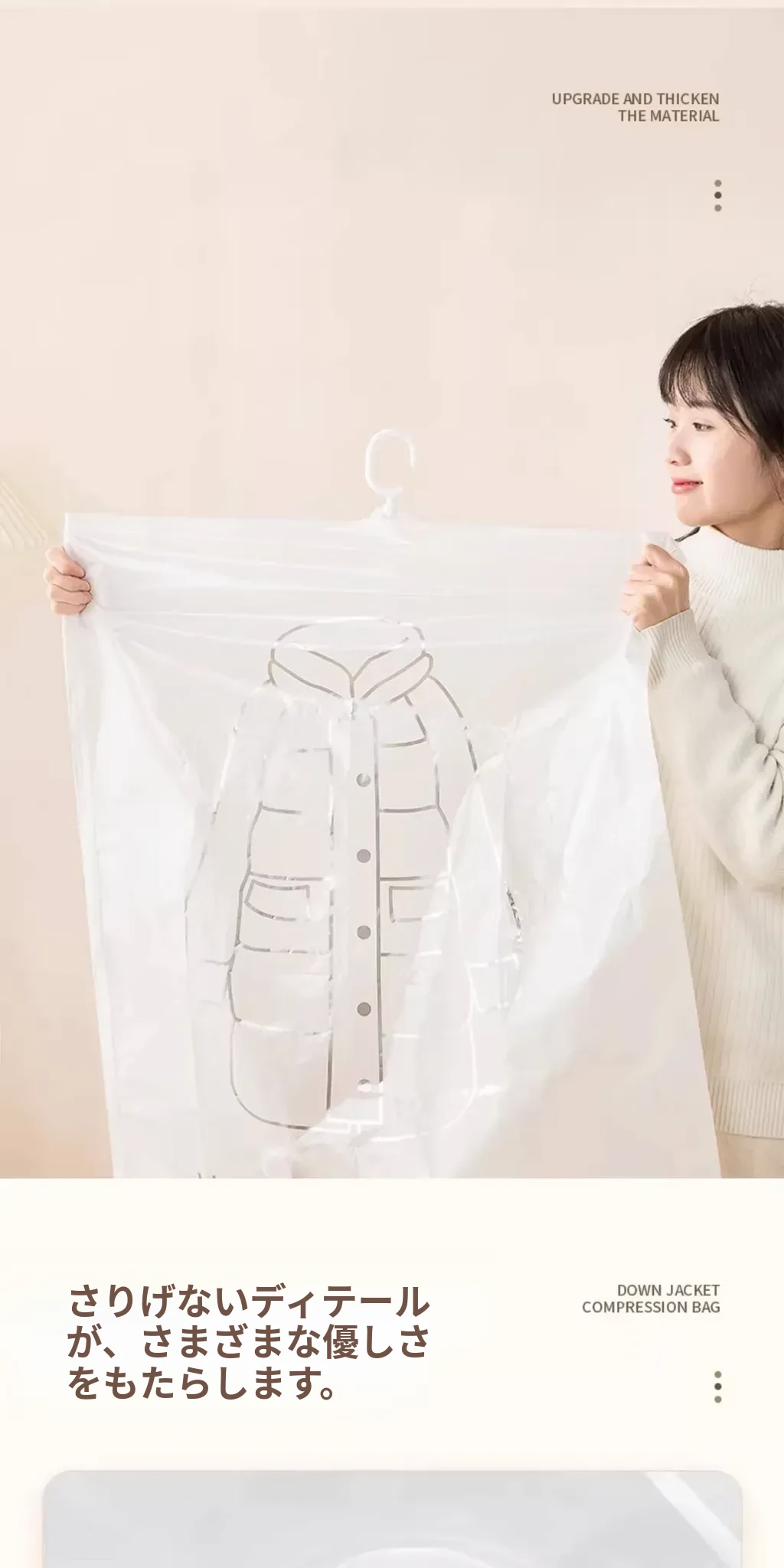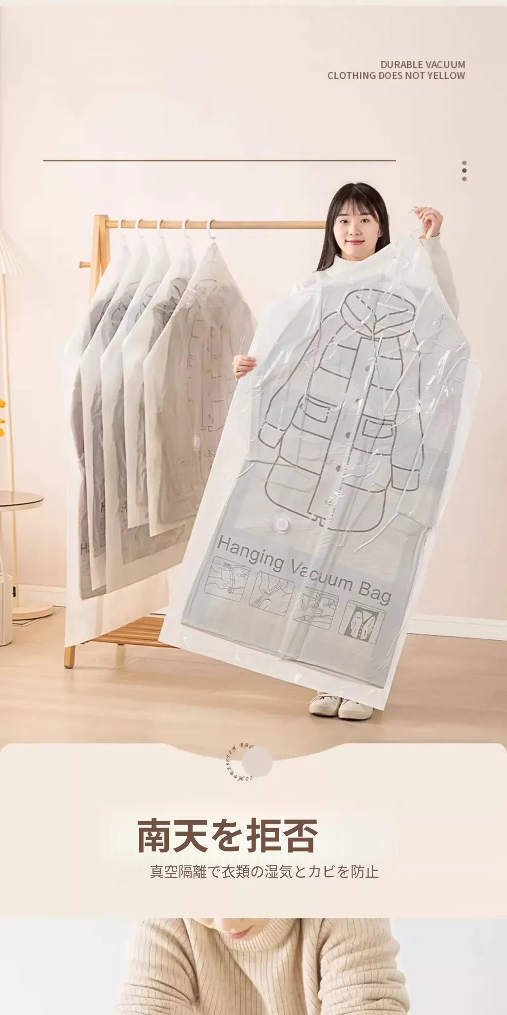 ダウンジャケット用真空圧縮収納袋 - 衣類整理の必需品!湿気から守る掛け式デザインで、クローゼットをスッキリ整理。スペースを有効活用して、衣類をスマートに収納!